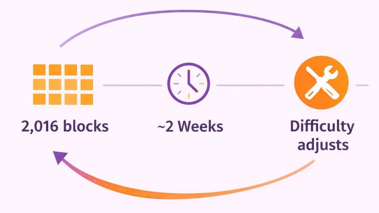Why does Bitcoin mining difficulty only adjust every 2,016 blocks?Because adjusting after every block would be too noisy. By waiting about two weeks’ worth of blocks, Bitcoin smooths out randomness and keeps block timing close to 10 minutes.