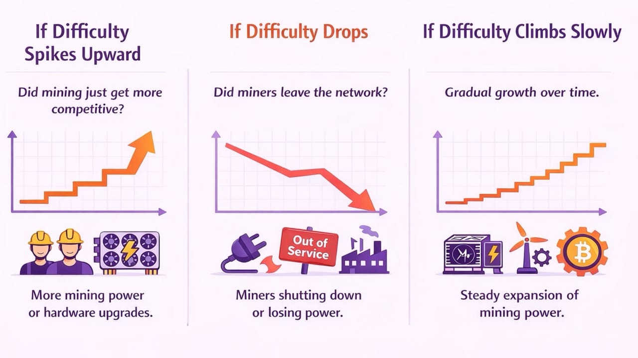 For beginners, difficulty is worth tracking because it explains changes you actually notice: shrinking rewards, miner exits, or sudden slowdowns. It shows what already happened inside the network, not what headlines predict.