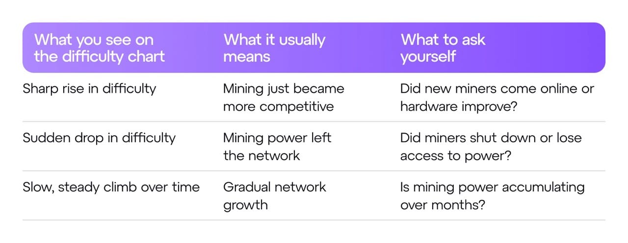 Difficulty reflects what already happened. It explains recent changes in mining power, not what will happen next.