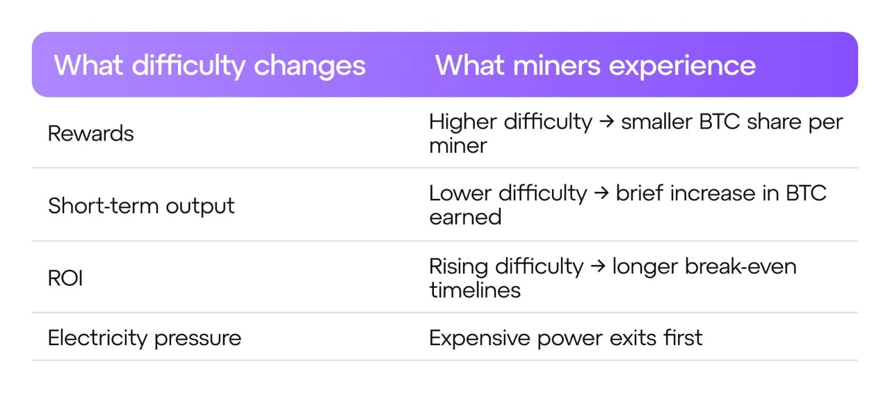 When difficulty drops, competition briefly eases. Miners who stay online can earn more BTC per unit of mining power until difficulty adjusts again.
