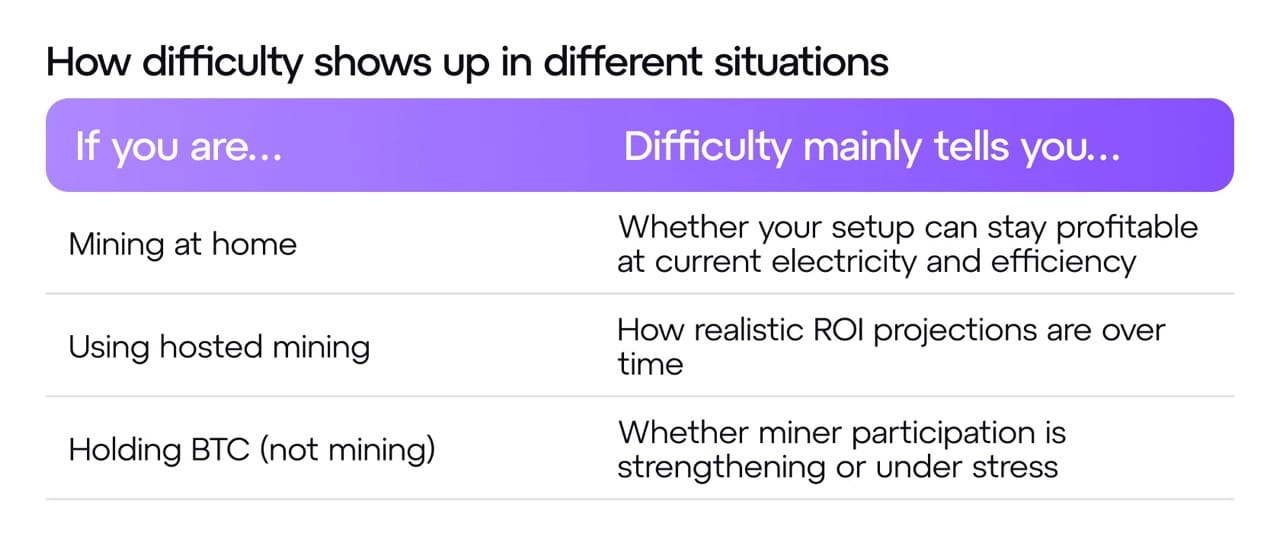 By now, difficulty should feel less like a threat and more like a signal. What that signal means depends on how you’re involved with Bitcoin.