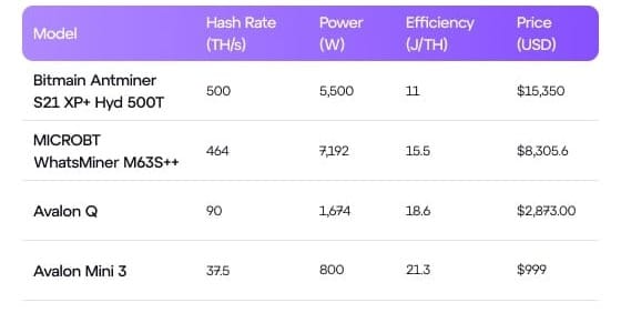It's common for amateurs to purchase machines like the Avalon Q or Avalon Mini 3 for a balance of price, performance, and ease of use. More professional ecosystem players usually opt for high-end, high-hashrate, and water-cooled models like the Antminer Bitmain Antminer S21 XP+ Hyd 500T, or MICROBT WhatsMiner M63S++ to maximize profitability in large-scale operations.