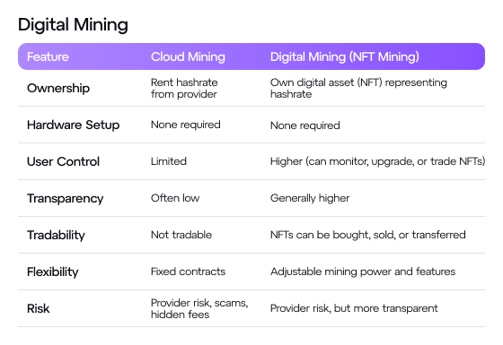 - Pros: More transparency and user control; you own your digital miners and they are tradable and can be scaled or upgraded; no hardware hassles; often more flexible and efficient than traditional cloud mining.
