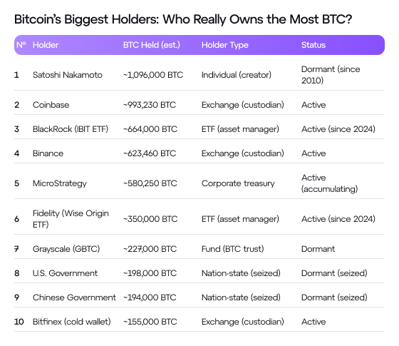In this article, we’ll explore the biggest Bitcoin holders in 2025 — not just who (or what) they are, but why that matters more than ever.