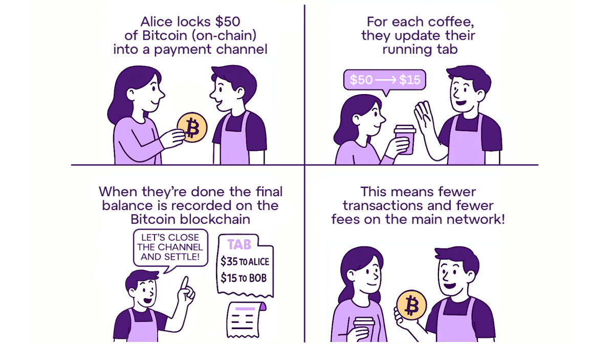 Imagine Alice and Bob do business together often—maybe Alice grabs a coffee from Bob’s café every morning. Instead of paying with Bitcoin each time (and dealing with slow confirmation times and annoying fees), they open a Lightning payment channel—a kind of digital bar tab.