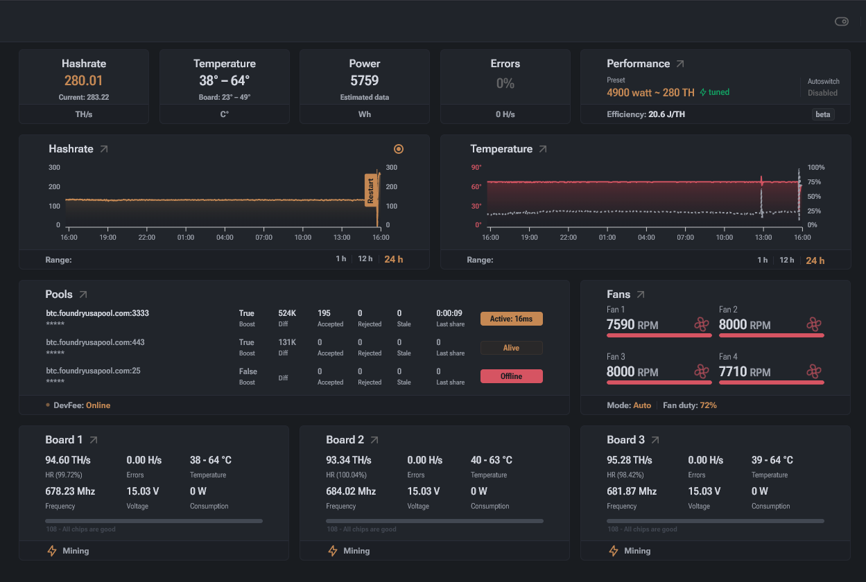 - managing hashrate, fans, voltage, and frequencies,