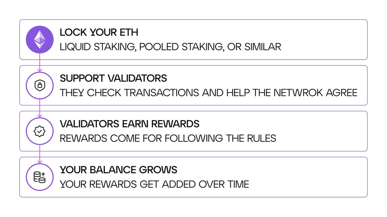 Staking ETH comes down to a clear set of steps. Once you’ve set things up, the network does the rest. Here’s the flow in order: