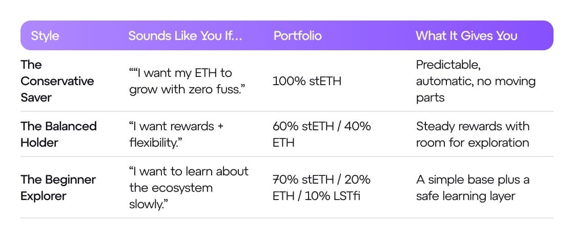 This mix keeps most of your ETH earning through stETH, while leaving a portion un-staked for swaps, gas fees, or trying new apps. It’s a good fit for beginners who want steady rewards but still like having room to move.