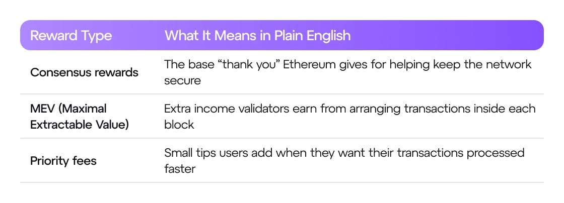 When you stake ETH, you earn rewards from a few different sources. Each one comes from activity happening on the network itself.