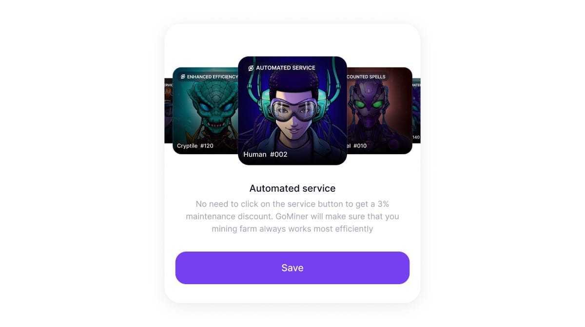 Humans eliminate the need to click on the Service button to get a 3% maintenance discount and more net rewards. They make sure that your mining farm always works most efficiently.