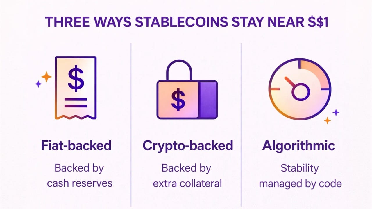 Because each design has a mechanism that pulls the price back toward its target — reserves for fiat-backed tokens, extra collateral for crypto-backed tokens, and supply adjustments for algorithmic models. The method varies, but the goal is the same: stay close to $1.