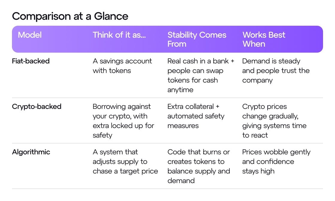 - How the main stablecoin models work in practice, and what keeps each one close to its target price