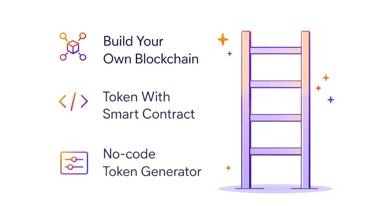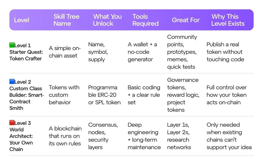 A beginner-friendly guide for crypto users who want to understand how tokens get created, from no-code tools to full blockchains, and what changes at each level.