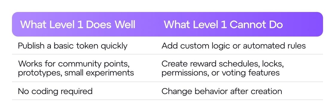 Level 1 is built for speed. It works well for community tokens, event badges, prototypes, or any situation where a basic asset needs to exist on-chain quickly. The tool handles the technical details, while the token itself remains straightforward.