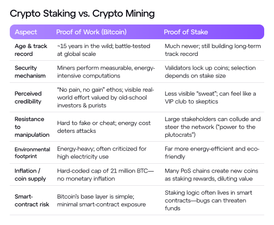 Now that you’ve seen how staking functions—more like becoming a shareholder in the network, where the coins you lock up represent your “stake” and potential for rewards—it’s helpful to compare that model to Bitcoin’s proof-of-work approach.