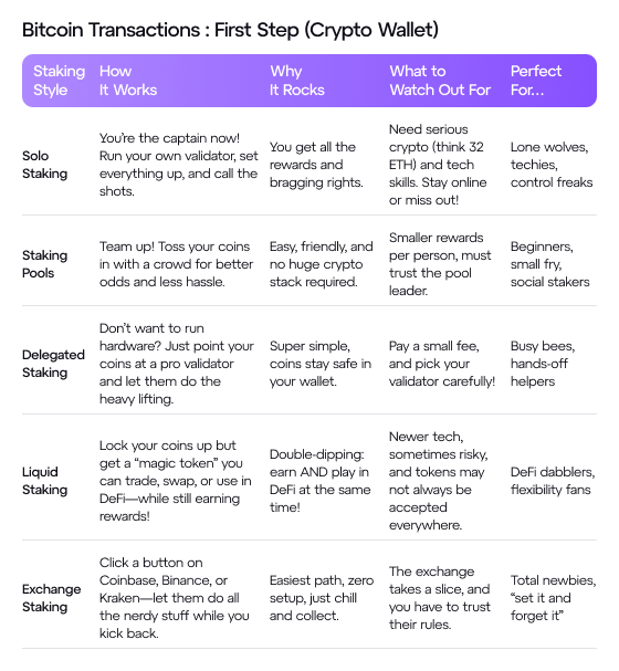 So, you’re ready to jump into crypto staking—but how to stake crypto? Good news: there’s a staking style for everyone, from lone wolves to team players and even those who like a little flexibility.
