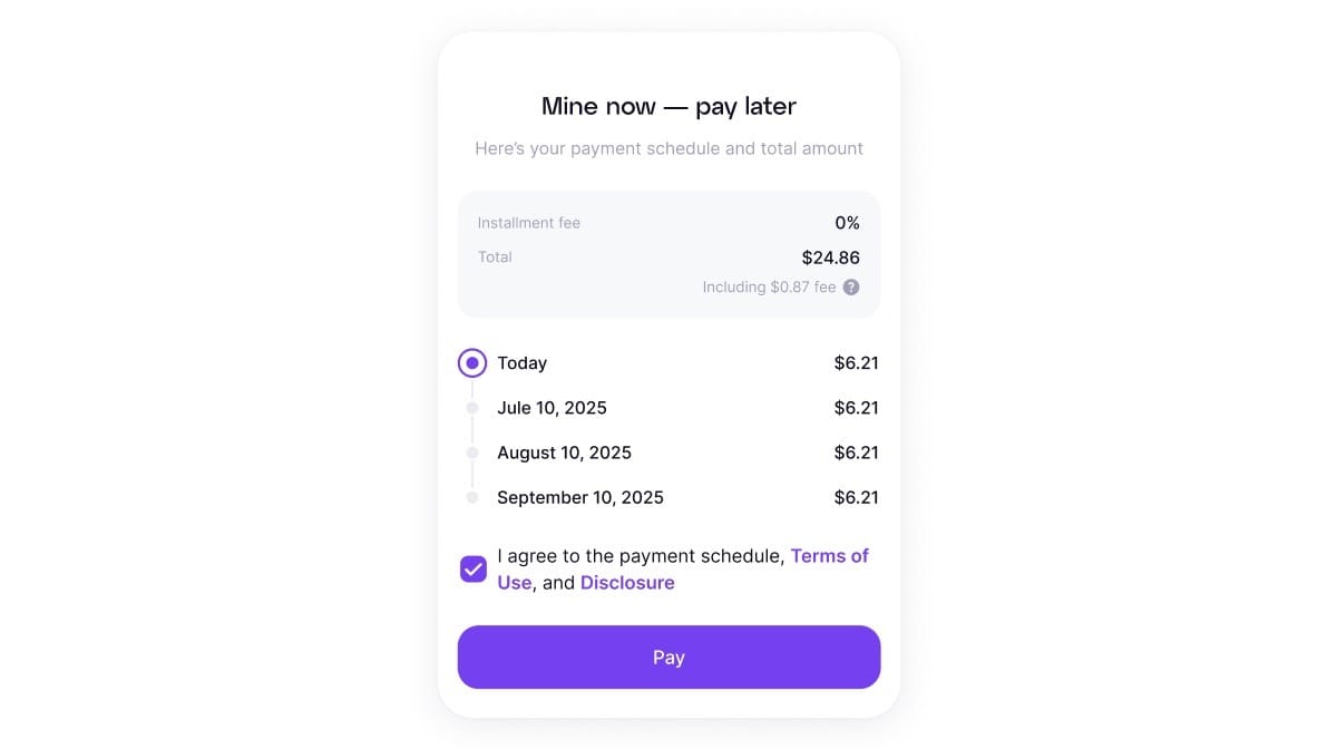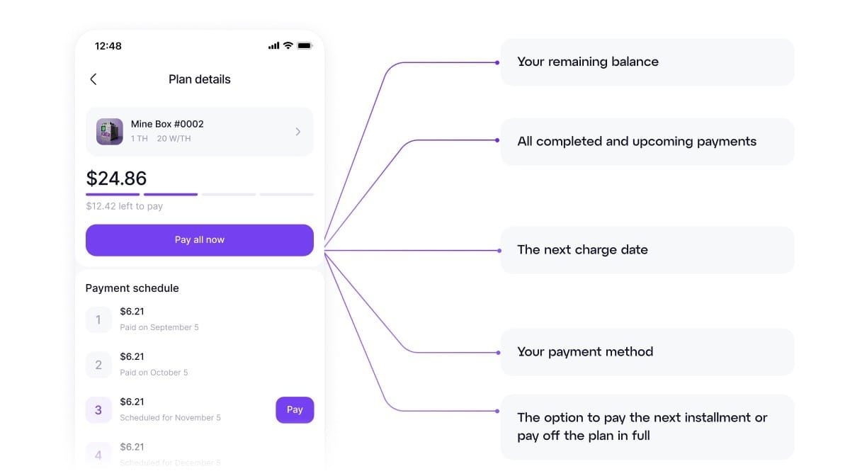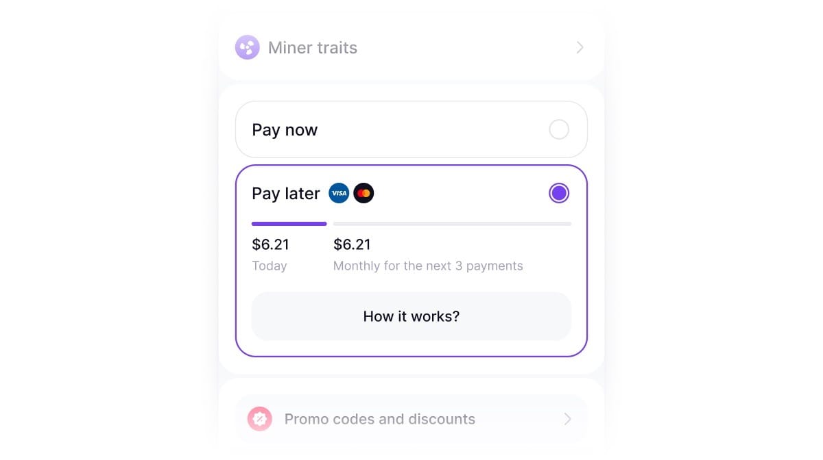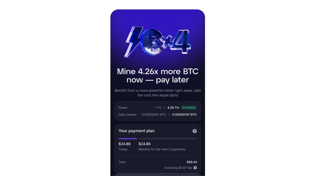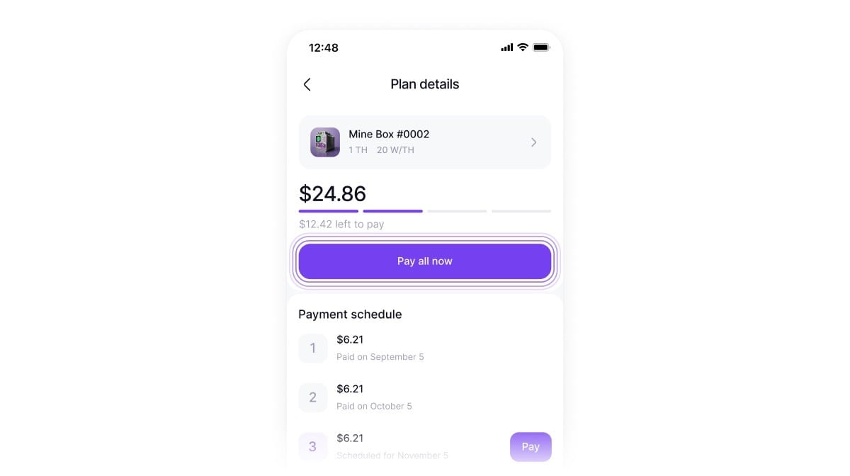 MNPL splits the miner’s price into a 25% upfront payment and equal monthly installments. Payments are charged automatically every 30 days.